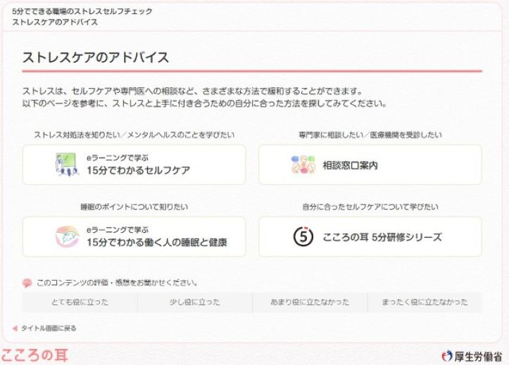 診断結果から、必要となるストレスケアのアドバイスが提供され、それらでセルフケアについての情報を得ることができます。また、下記のようなセルフケアを学べるeラーニング資料などをの各種ツールを利用することができます。ぜひとも、活用されることをお薦めします。